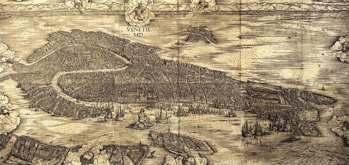Jacopo de' Barbari's map of Venice, made in 1500. The map is nine feet wide, and so detailed that you can see exactly what each part of the city looked like in the early sixteenth century.